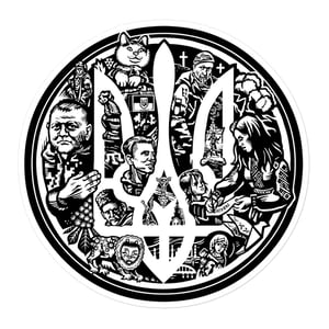 This art contains symbols of Ukrainian resistance to Russian aggression, people alive and fallen, cities: